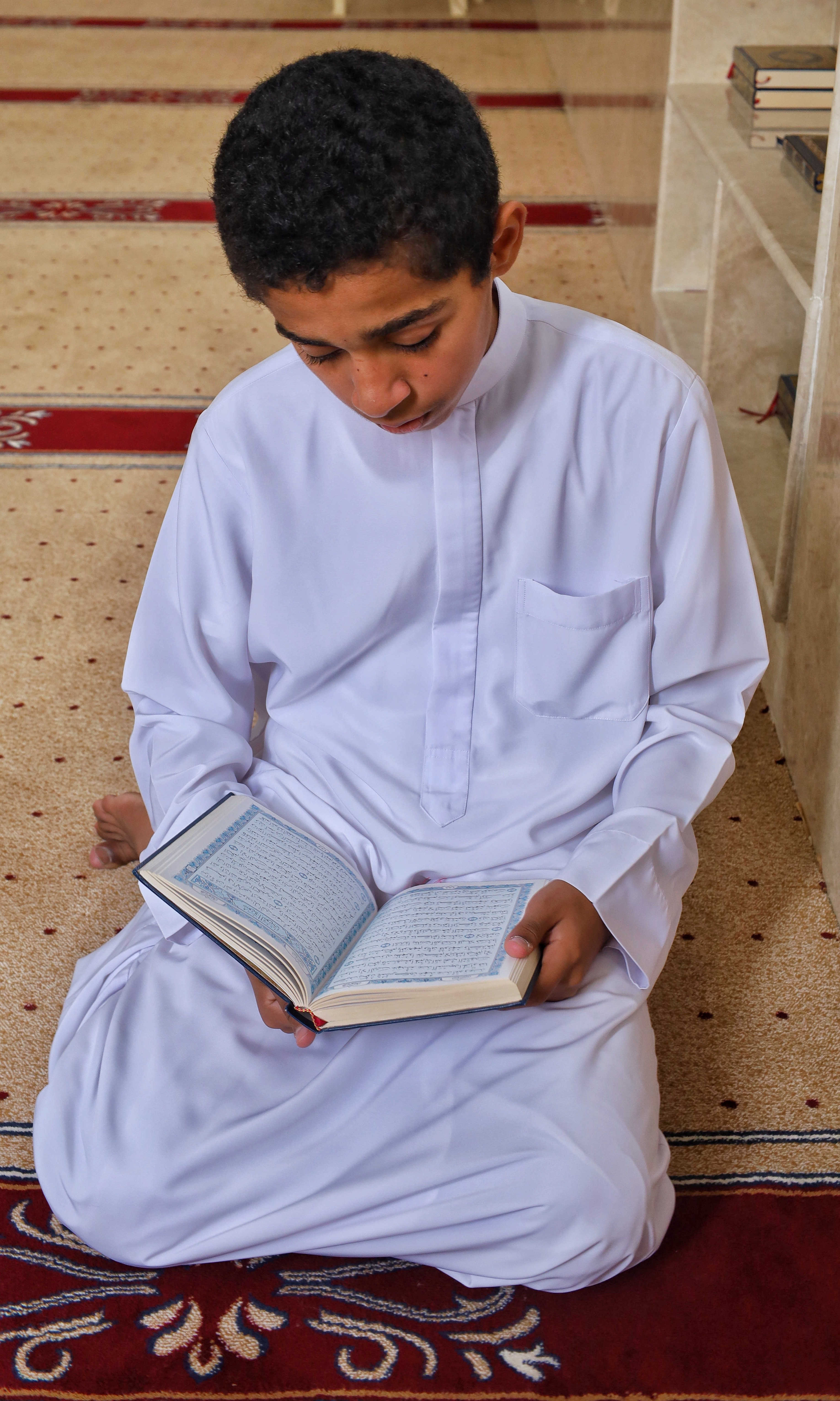 طفلان يجلسان على أرض المسجد، يشير أحدهما إلى الكتاب ليشرح للآخر، في لحظة بسيطة تعكس التعاون وصفاء المكان