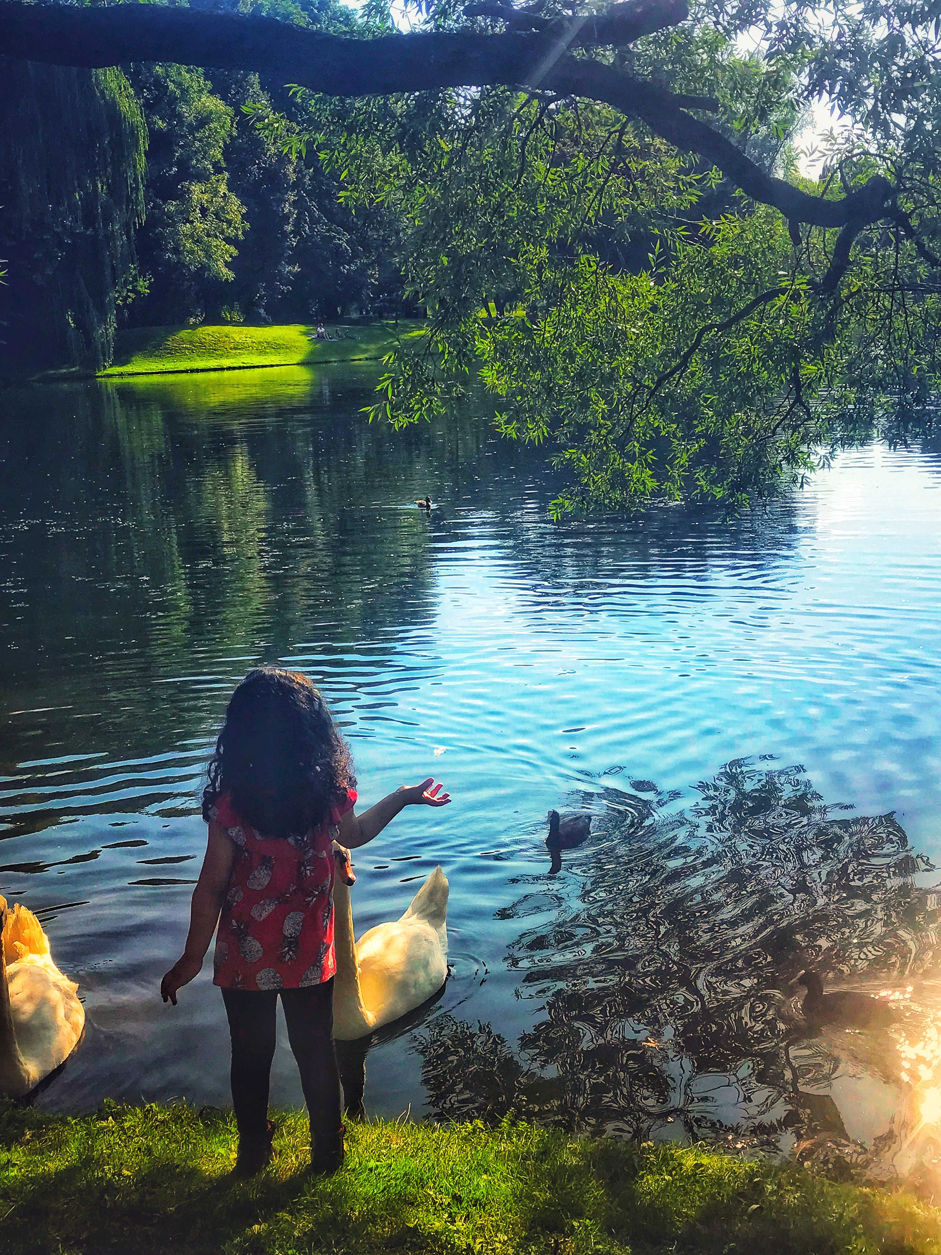 الطفلة والبجعة ،، تومي طفلة صغيرة على ضفاف بحيرة تتأمل بجعة بيضاء