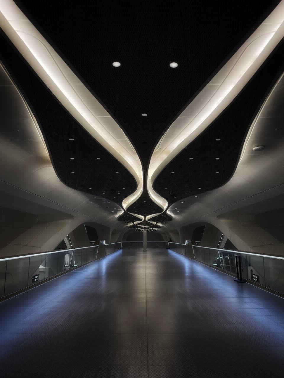 محطة مترو مركز الملك عبدالله المالي (KAFD Metro Station) في الرياض، وقد صمَّمها مكتب زها حديد أركيتكتس. من تصوير نادرة الماجد