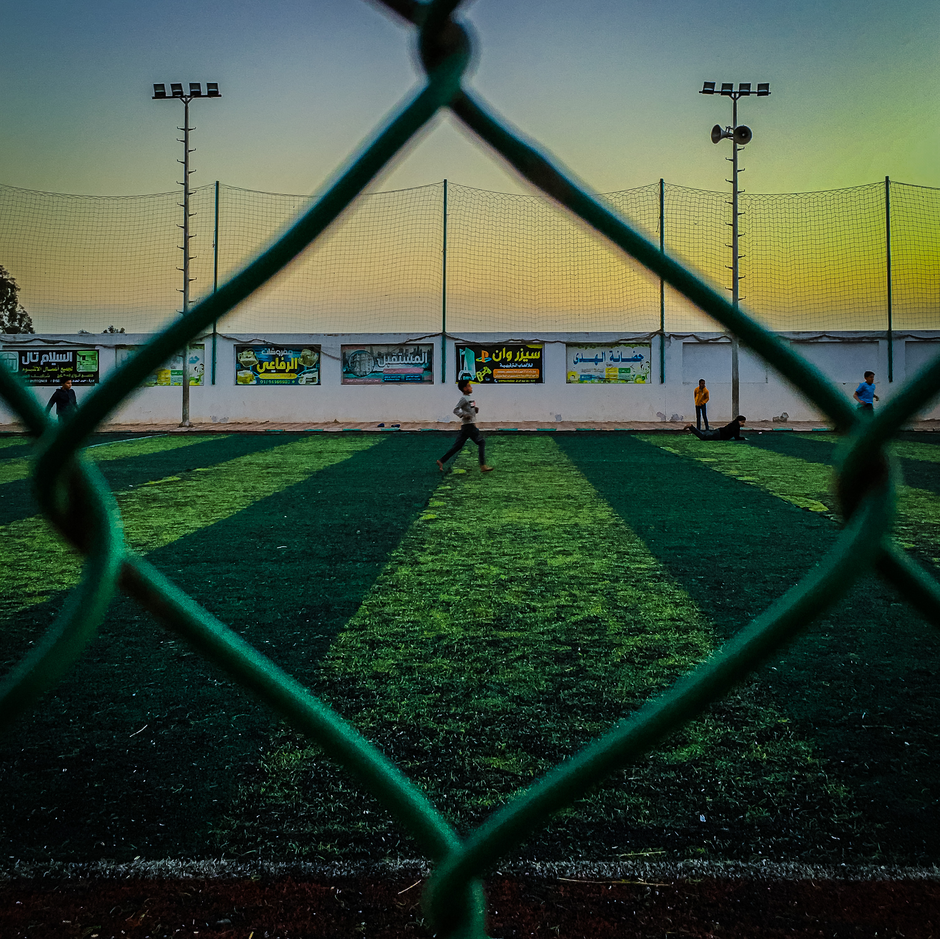 من خلف سياج بسيط، تتجلى لحظة حية من الشارع المصري، حيث تتحول مساحة صغيرة إلى عالم واسع من الأحلام والحركة. يظهر أحد الأطفال في حالة اندفاع، كأنه يركض نحو شيء أكبر من مجرد لعبة، بينما يقف الآخرون على الهامش بين انتظار ومراقبة. الإطار الحديدي في المقدمة لا يمثل عائقًا بقدر ما يمنح المشهد عمقًا بصريًا، وكأنه يضعنا نحن المشاهدين في موقع المتفرج على قصة تتكرر يوميًا دون أن ننتبه لها. الخطوط الممتدة في أرضية الملعب تقود العين نحو الحركة، بينما السماء في الخلفية تضيف بعدًا هادئًا يعاكس صخب اللحظة. هذه الصورة لا توثق مباراة كرة قدم فقط، بل تعكس فكرة أوسع: الطفولة التي تبحث دائمًا عن مساحة للانطلاق، حتى وإن كانت محدودة بسياج. هنا، يصبح اللعب فعل حرية، وتتحول المساحة الضيقة إلى ساحة واسعة للأمل.