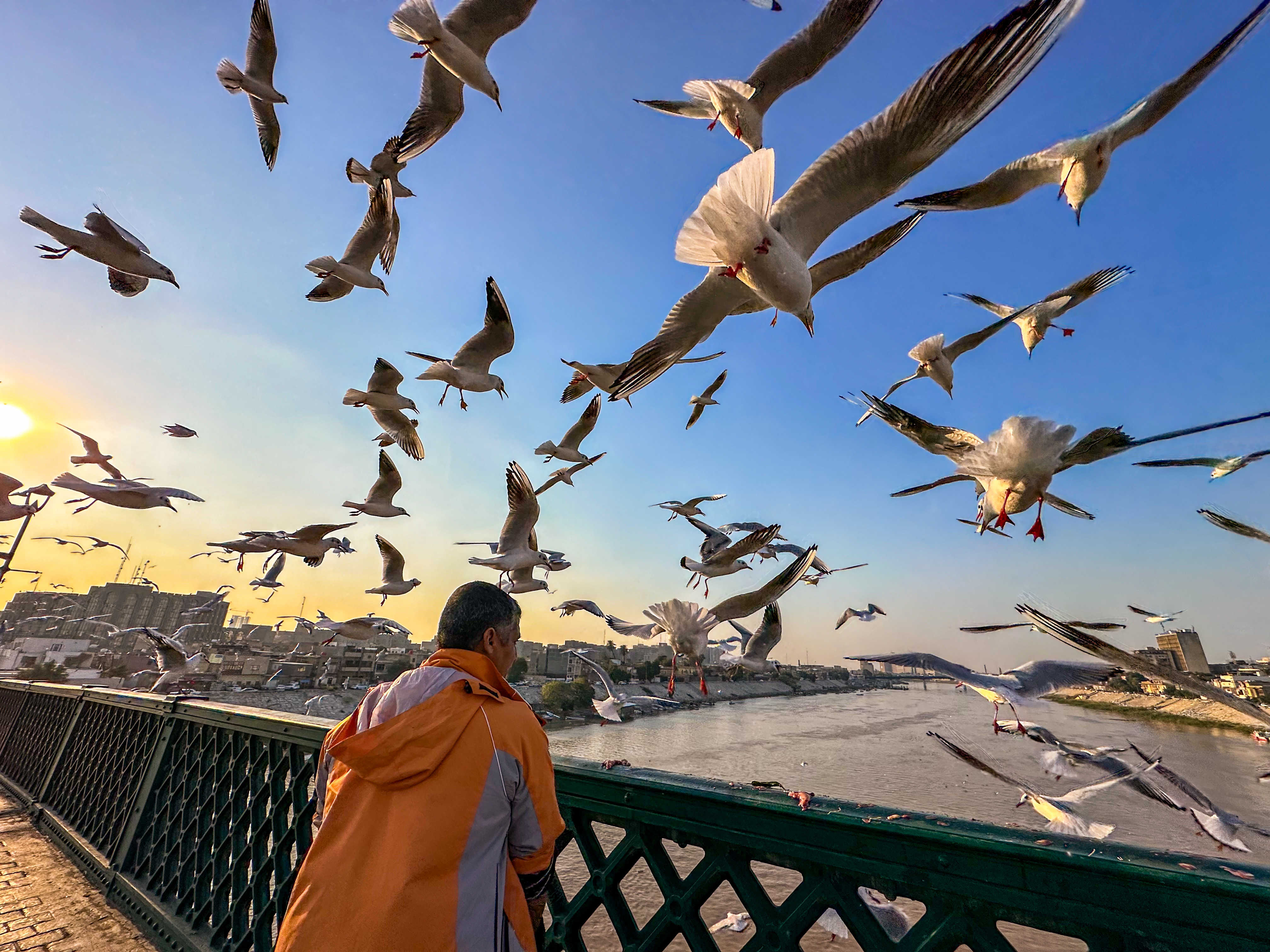 في مشهد جميل لطيور النواس في العاصمه العراقيه بغداد. نوارس نهر دجله
