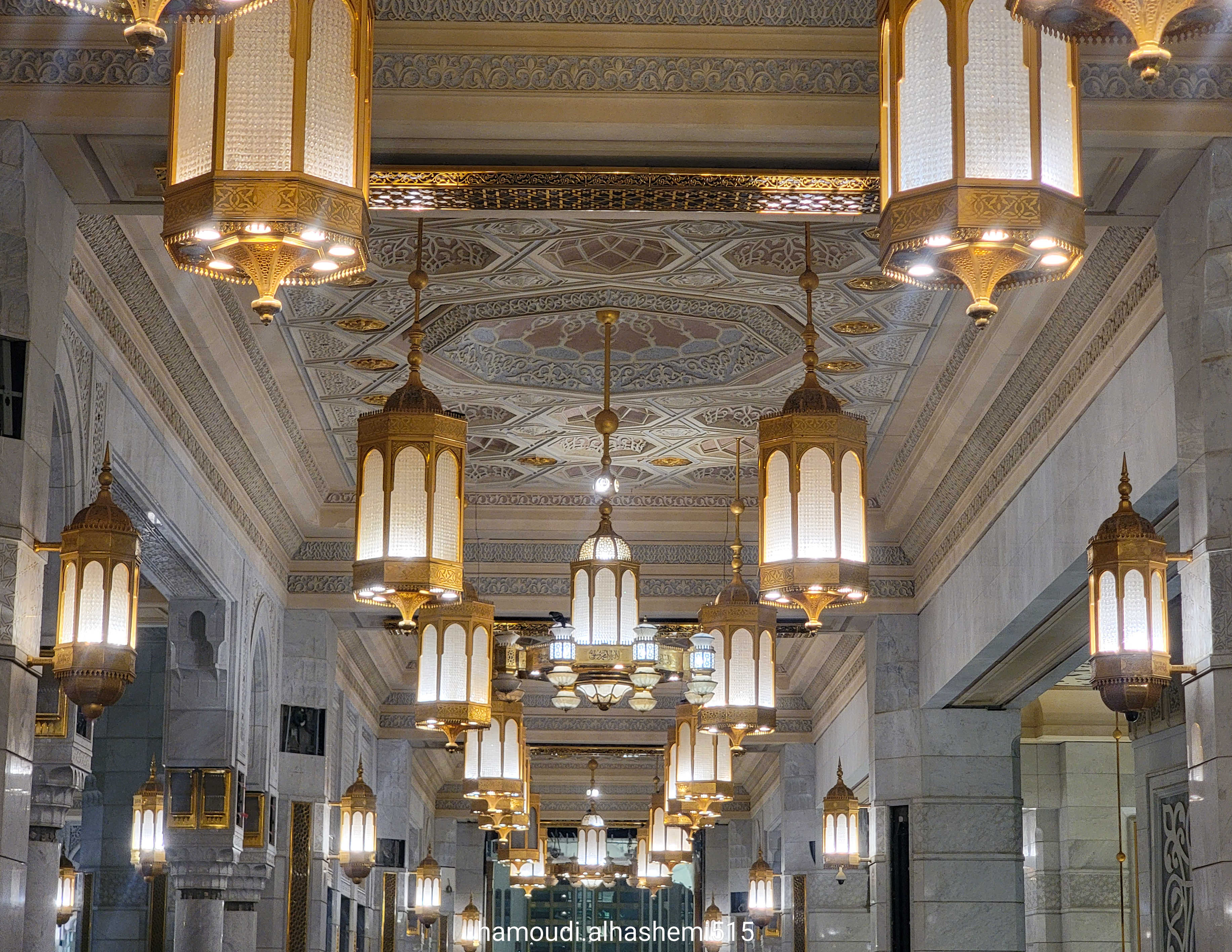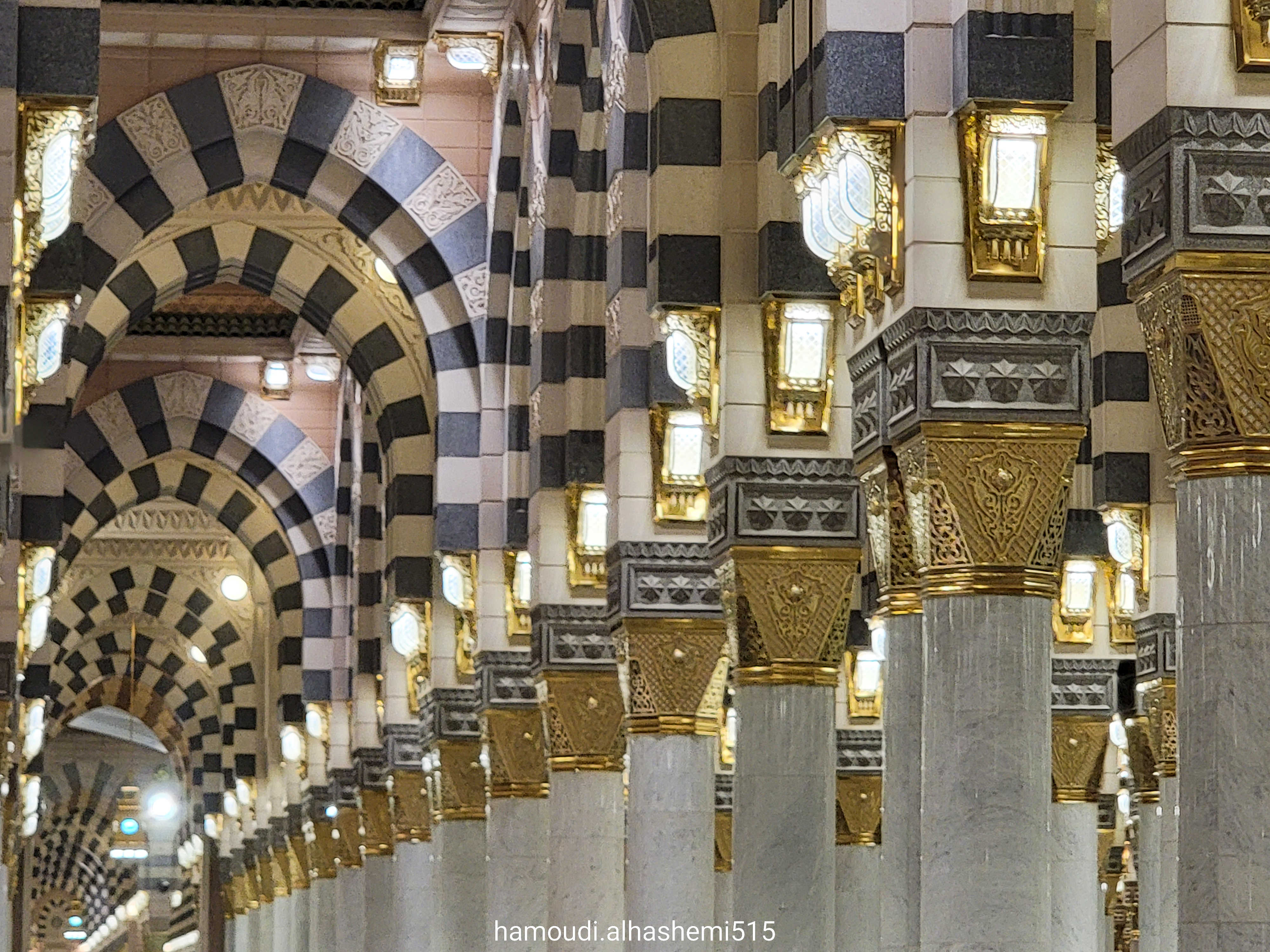 إنارة الحرم تنساب كالنور الإلهي في أرجائه و أعمدة المسجد النبوي تنطق بالسكينة والجلال.